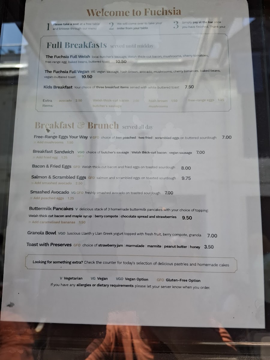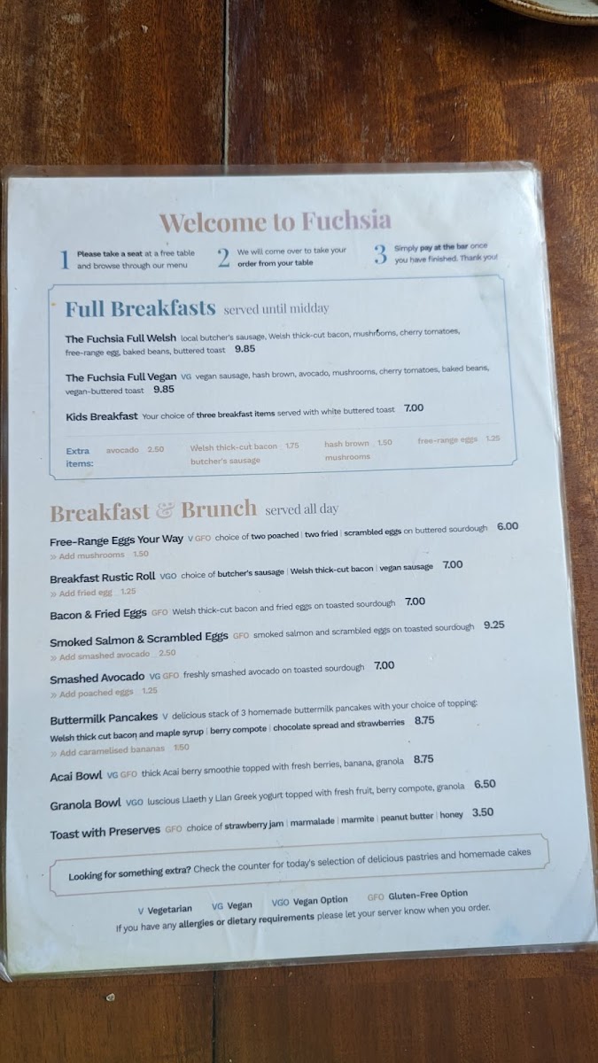 Welcome to Fuchsia, a charming café nestled in Upper Frog Street, Tenby, offering a delightful selection that's sure to please any palate. The menu features hearty options like the Fuchsia Full Welsh and innovative Fuchsia Full Vegan, both priced at £10.50, making them excellent starting points for breakfast enthusiasts. For a lighter touch, you might enjoy the Smashed Avocado or FreeRange Eggs Your Way, each under £8.